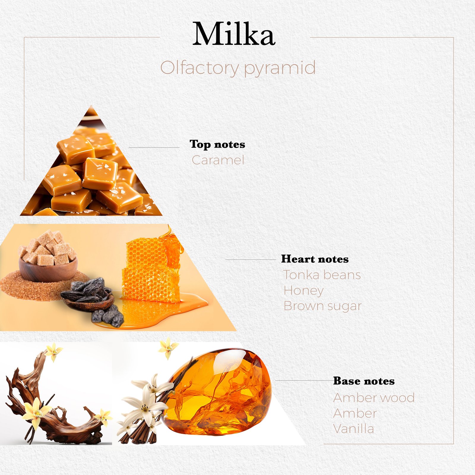 A decadent symphony of sweetness and elegance. It opens with the rich warmth of vanilla, wrapped in a delicate veil of caramel and amber. As it settles, creamy milk notes melt into the heart, softening the richness and adding a comforting, irresistible smoothness. The base lingers with tonka and musk, leaving behind a sensual trail that’s both cozy and captivating
